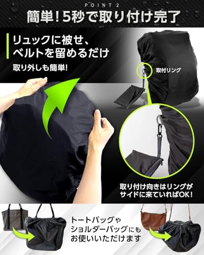 (特にサイドからの浸水防止に効果的です) - リュックのサイズや形状に応じてワンサイズ大きめを選び、無理なく装着すること