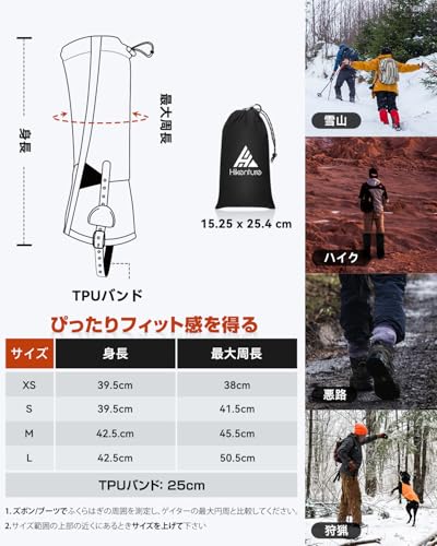 HIKENTUREゲイターは、防水防風性能と高耐久性を兼ね備えたロングタイプのレッグカバーで、特に冬山登山や悪天候下のアウトドア活動に適しています。