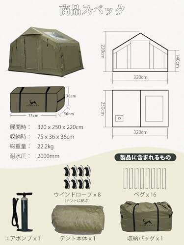 MC エアーテント 8㎡オックスフォード素材のインフレータブルロッジ型テントは設営が簡単で広々とした居住空間が魅力ですが、購入前に把握すべき注意点も存在します。